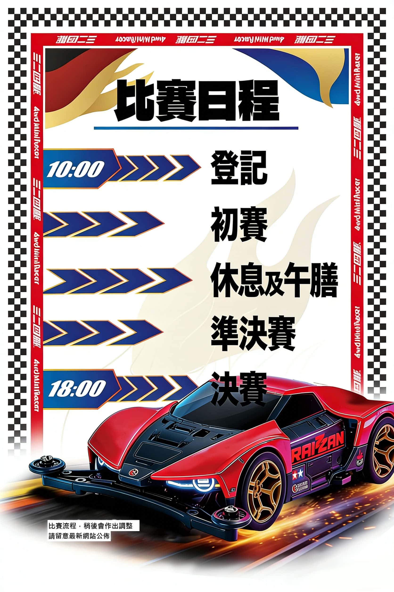 - 「本活動涉及之迷你四驅車屬於 STEM 科技教育模型器材,涉及精密機械組裝、電力原理及高速動能。參賽者及其監護人已充分了解相關技術要求及潛在風險。」