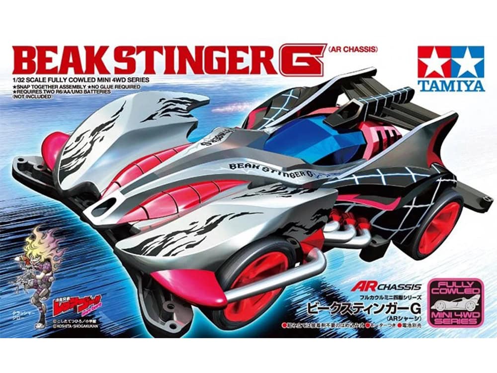 本套件為採用軸傳動四輪驅動的高效能競速車塑膠模型組裝套件。喙毒刺G Beast Stinger G是連載於小學館《Coro Coro Aniki》雜誌、小瀨哲弘老師創作的迷你四驅車漫畫《四驅兄弟 Return Racers!!」登場的勁敵賽車。本車特色在於融合了1990年代於《快樂龍 Coro Coro Comic》連載之《四驅兄弟》中三台賽車——銀影號、巨霸號、黑蜘蛛的設計,形成獨具「合成獸賽車」特色的震撼造型。套件內附金屬質感貼紙,可為銀色ABS樹脂車體增添緊緻質感。