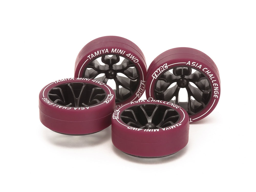 • Small diameter tires are low friction, letting your car slide more through turns and maintain speed, and also reducing bounce after landings. They have white printed sidewall designs: TAMIYA MINI 4WD / ASIA CHALLENGE and the TMAC logo.